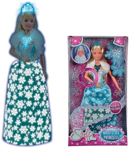 Ta poupée Steffi 29cm porte une magnifique robe bleue et blanche avec des flocons de neige qui brillent dans le noir. Presse son coude et tu verras sa tiare et son collier s'illuminer ! Ta poupée ressemble a une véritable princesse des glaces. A partir de 3 ans. ...