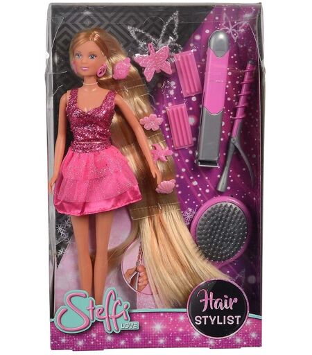Simba Toys Steffi Love Coiffeuse Styliste Steffi apporte son propre matériel de stylisme. Pour ses longs cheveux, tout est inclus. Qu'il s'agisse de vagues, de lisses ou de boucles, tout est possible avec le set de coiffage. Stylez Steffi d'après vos conceptions et vos idées. Les belles barrettes décorent en outre votre coiffure. Détails Steffi (29 cm) avec des cheveux longs, une brosse, un fer à friser, un lisseur et de nombreux accessoires pour les cheveux ...