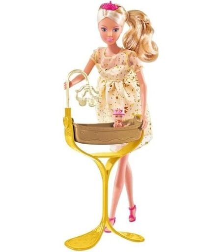 Ta poupée Steffi porte une jolie robe royale avec des sequins et une couronne. Elle est enceinte et est impatiente d'accueillir son bébé et de le bercer dans son couffin royal ! Au moment de l'accouchement le ventre de Steffi se désolidarise pour laisser bébé sortir ! Ta poupée retrouve par la suite son ventre plat. ...