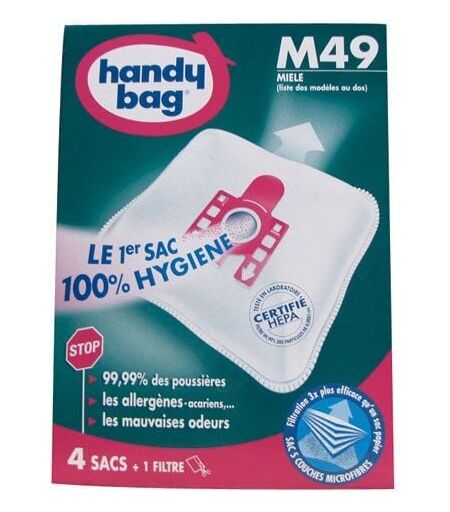 Sac aspirateur handy bag non tissé x4 miele m49 CARACTERISTIQUESFiche produit constructeur / fournisseur : https://static.findis.fr/data/articles/1071454/fiche-produit-2314.pdf ...