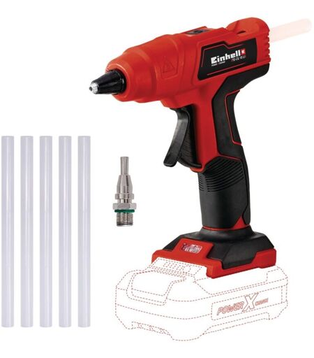 Einhell Pistolet à colle sans fil te-cg 18 Li - Solo Power X-Change (18V, Prêt à l'emploi en 120 secondes, avec 5 bâtons de colle 12mm + embout plat) Livré
