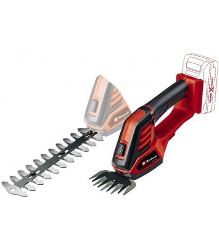 • La cisaille à gazon taille-buissons sans fil GE-CG 18/100 Li-Solo Einhell est un outil puissant de la gamme Power X-Change. Batteries Power X-Change combinables entre elles en toute flexibilité • L’outil fonctionne avec une batterie 18 V Power X-Change. L’outil est vendu sans batterie ni chargeur : ces accessoires sont disponibles séparément, notamment dans le Starter Kit très pratique. • La lame coupe-herbe est parfaitement adaptée à l’entretien des bordures de gazon. Les lames taille-buissons découpées au laser et affûtées au diamant sont idéales pour élaguer les haies et buissons. • Le changement d’accessoire s’effectue très facilement et sans outil. La surface Softgrip de la cisaille à gazon taille-buissons sans fil assure ergonomie et prise en main parfaite à chaque mouvement. • Pendant l’utilisation de l’outil et lors de son nettoyage, le carter d’engrenage fermé permet d’éviter le contact avec des éléments qui sont lubrifiés avec de l’huile de transmission.> ...