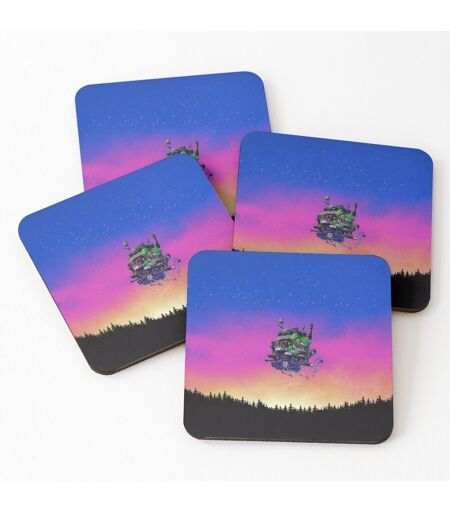 Liège Sous-Verres En Bois Le Château Volant De Howl Au Coucher Du Soleil 9,5 Cm Lot De 4 Pour Boissons Café Table