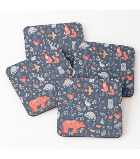 Liège Sous-Verres En Bois Forêt De Conte De Fées. Renard, Ours, Raton Laveur, Hiboux, Lapins, Fleurs Et Herbes Sur Fond Bleu. 9,5 Cm Lot De 4 Pour Boissons Café Table
