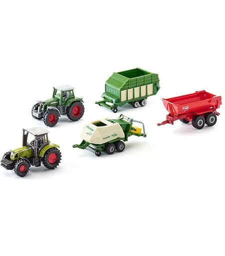 Ce coffret comprend 5 véhicules en métal avec des pièces en plastique : un remorqueur Claas, un remorqueur Fendt, une benne basculante, une presse à fourrage et une remorque à foin. Dimensions de la boîte : 29.5 x 11 x 5 cm. Age minimum : 3 ans ...