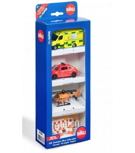 Dans une situation d'urgence, chaque seconde compte. Il est donc important que les ?quipes de sauvetage arrivent rapidement sur place. Sur route ou dans les airs : avec le coffret Sauvetage de siku, une aide rapide est en approche , les secours sont d?j? en route ! Le coffret se compose de trois mod?les de v?hicules et de divers accessoires. Une VW Beetle avec l'inscription internationale ? Ambulance ?, une peinture rouge d'intervention et une bande lumineuse bleue sur le toit, fait office de voiture m?dicale. Les porti?res du v?hicule s'ouvrent. Un Mercedes Sprinter jaune vif avec une impression multicolore d'envergure et une inscription verte ? Ambulance ? sur les c?t?s vient ? son secours comme v?hicule de secours. En outre, un h?licopt?re est ?galement utilis? pour l'assistance a?rienne. Ses pales de rotor sont rabattables et l'h?lice tourne. Pour s?curiser le lieu de l'accident, le kit contient en outre deux barres lumineuses et deux pyl?nes blancs et orange. ...
