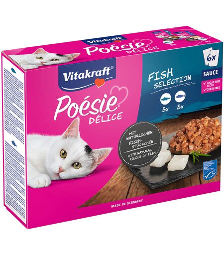 Délicieuse, savoureuse - ton chat va adorer cette nourriture humide. Vitakraft Poésie combine des morceaux de viande juteuse ou du poisson délicat dans une sauce fine ou une gelée délicieuse pour en faire un véritable "poème" savoureux. Les... ...