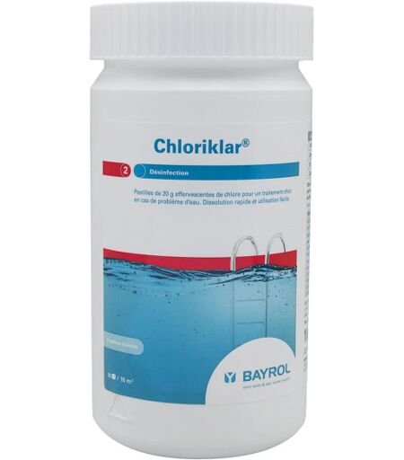 Bayrol Chloriklar : un traitement choc pour votre piscine Pour garantir une baignade confortable à vos proches, pensez à leur offrir une eau de piscine de qualité. Une eau de piscine de qualité passe avant tout par un taux de chlore suffisant ajusté. C'est pourquoi Bayrol Chloriklar vous sera efficace. Assurant un traitement de l eau choc, ce produit choc augmente rapidement et efficacement la teneur en chlore actif. Bayrol Chloriklar protège ensuite le chlore actif contre les rayons UV du soleil. Il ne provoque aucun dommage pour vos filtres. Conseil d'utilisation Filtration en marche, pH entre 7,0 et 7,4, ajoutez les pastilles dans le skimmer ou les dissoudre au préalable dans un seau avant de le verser. Dosage standard 10 pastilles pour 10 m3 d'eau en cas de problème. Produit garanti MADE IN EUROPE Efficacité testée et contrôlée en conditions réelles Emballages du produit certifiée UN Se référer à la notice technique ci-jointe + bien lire les consignes présentes sur l'emballage avant utilisation. ...