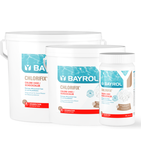 Une eau de piscine, très agitée, est souvent exposée à des risques d'infections dus aux micro-organismes apportés par les baigneurs et l'air extérieur. De ce fait, il convient d'effectuer un traitement de l'eau couramment afin de la garder claire et saine à long terme. [fsm display="image" ids="1742" link="0"] Optez pour le Chlore choc Bayrol Chlorifix Il rattrape efficacement l'eau en cas de problèmes ! Chlorifix est un chlore en granulés à dissolution rapide. Il détruit toutes les bactéries et éradique les impuretés rapidement. Les granulés de chlore sont pratiques d'utilisation. Ils n'occasionnent aucun dépôt et ne colmatent pas les filtres. Granulés de qualité supérieure : moins de poussière à l'utilisation et dissolution immédiate Ne décolore pas Compatible tous revêtements même foncés Idéal démarrage de saison Chlore choc : apport intensif et rapide de chlore actif Ne trouble pas l'eau N'influence pas le pH Formats disponibles : 1 kg / 5 kg / 10 kg Informations utiles Filtres : Tous Volume : Tous Où : Dans l' eau Quand : En cas de problème d'eau Dosage : 200 g pour 10 m³ Mode d'emploi Contrôlez le pH à l'aide des bandelettes d'analyse Bayrol ou du Pooltester Bayrol, et ajustez-le si nécessaire entre 7,0 et 7,4. En cas de problème d'eau : Versez 200 g de Chlorifix pour 10 m³ d'eau directement dans le bassin, devant les buses de refoulement ou en plusieurs endroits du bassin, filtration en fonctionnement. Il est préférable d'effectuer cette opération le soir après la baignade. Laissez la pompe fonctionner pendant 12 heures. Vous pourrez vous baigner à nouveau dès que le taux de chlore sera descendu en-dessous de 3 mg/L. Pour une désinfection régulière : Utilisez 50 g de Chlorifix pour 10 m³ d'eau. Se référer à la notice technique ci-jointe + bien lire les consignes présentes sur l'emballage avant utilisation. Recommandations importantes Éviter tout contact direct avec des matériaux non résistants au chlore. Après chaque utilisation, rincer et sécher le doseur avant de le ranger. Ne jamais mélanger sous forme concentrée différents produits chimiques. Ajouter toujours le produit dans l'eau et jamais le contraire. Ne jamais mettre directement au contact d'un revêtement fragile (liner, peinture, etc.) : risques de décoloration et de dégradation. Avertissements Dangereux. Respecter les précautions d'emploi. Utiliser les biocides avec précaution. Avant toute utilisation, lire l'étiquette et les informations concernant le produit. Avant toute utilisation, assurez-vous que celle-ci est indispensable, notamment dans les lieux fréquentés par le grand public. Privilégiez chaque fois que possible les méthodes alternatives et les produits présentant le risque le plus faible pour la santé humaine et animale et pour l'environnement. ...