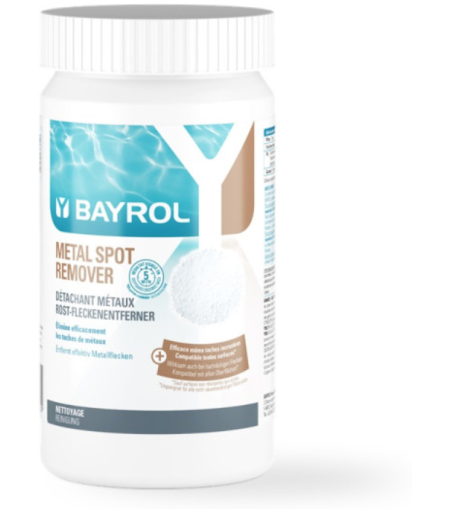 Optez pour le Détachant métaux Bayrol Metal Remover Il élimine efficacement les tâches de métaux ! Le Détachant métaux Bayrol Metal Remover élimine les tâches de rouille, même fortement incrustées, sur le fond, les parois et les abords du bassin. Où : Tâche localisée = Sur une éponge Tâche à plusieurs endroits dans le bassin = Directement dans l'eau Conditionnement : 0,8 kg Mode d'emploi Contrôlez le pH à l'aide des bandelettes d'analyse Bayrol ou du Pooltester Bayrol, et ajustez-le si nécessaire entre 7,0 et 7,4. Pour une application ciblée même sous l'eau : Avec l'Applicateur 2-en-1 Bayrol, saupoudrez 5 à 10 g de Metal Spot Remover sur l'éponge légèrement humidifiée. Fixez l'applicateur sur le manche télescopique, puis immergez-le et positionnez-le directement sur la zone à traiter (par exemple le fond du bassin, la ligne de flottaison ... ). Laissez agir quelques minutes puis frottez pour faire disparaître la tache. Pour une application généralisée dans tout le bassin : Arrêtez la filtration, saupoudrez 15 à 30 g de Metal Spot Remover directement dans le bassin, au-dessus des dépôts brunâtres. Laissez agir pendant 20 minutes, puis relancez la filtration. Après le traitement en prévention : Ajoutez 600 ml de Calcinex pour 10 m³ pour prévenir l'apparition de nouvelles taches / dépôts métalliques. Se référer à la notice technique ci-jointe + bien lire les consignes présentes sur l'emballage avant utilisation. Recommandations importantes En cas d'eau dure, un léger trouble peut apparaître autour de la zone traitée ; il sera éliminé par la filtration. Si ce produit a pris en masse, le secouer avant utilisation pour retrouver son aspect poudre d'origine. Ne convient pas à toutes les surfaces de piscine non résistantes aux acides. Tester le produit sur une petite surface avant de l'utiliser. Avertissements Ne jamais mélanger sous forme concentrée différents produits chimiques. Ajouter toujours le produit dans l'eau et jamais le contraire. Dangereux. Respecter les précautions d'emploi. ...