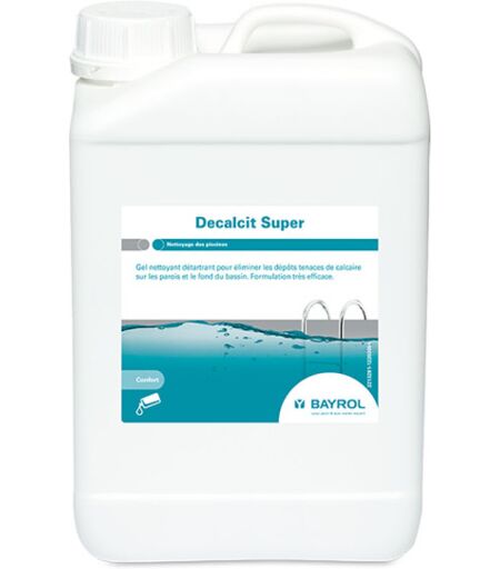 Avec le temps, la piscine est sujette à diverses détériorations dues aux micro-organismes et à la température extérieure. Cela entraîne des dépôts calcaires sur les parois et le fond du bassin. A long terme, le calcaire peut entraîner à son tour, des dépôts d'algues, nuisibles à l'état de votre bassin. Optez pour le Nettoyant parois Bayrol Decalcit Super Il nettoie et désincruste en profondeur les tâches les plus tenaces ! Le Nettoyant parois Bayrol Decalcit Super élimine facilement le tartre, les dépôts tenaces de calcaire, de rouille et les tâches fortement incrustées sur les parois des bassins. Pour tous types de filtres Pour tout volume de bassin Appliquer sur les parois de la piscine En début de saison Dilué entre 20% et 100% Conditionnement : 3 litres Mode d'emploi En cas de fortes salissures : Diluez Decalcit Super à 20 % (2 L pour 10 L d'eau). Appliquez la solution sur les parois mouillées à l'aide d'une brosse ou d'un balai-brosse, ou versez-la directement dans le réservoir de l'applicateur 2-en-1 Bayrol équipé de son éponge, fixé sur un manche télescopique. Laissez agir environ 15 minutes, puis rincez abondamment à l'eau. En cas de traces tenaces, répétez l'opération. Pour le nettoyage des joints : Diluez le produit à 20 % minimum, laissez agir maximum 5 minutes, puis rincez abondamment à l'eau. Se référer à la notice technique ci-jointe + bien lire les consignes présentes sur l'emballage avant utilisation. Recommandations importantes Avant utilisation, faire un essai sur une petite surface. Veillez à ne pas utiliser ce produit sur les matériaux ne résistant pas aux produits acides (ex.: aluminium, émail non traité, etc.). Ne pas laisser agir le produit sur les parties chromées ; en cas de contact avec le chrome, rincer immédiatement à grande eau. Bien aérer les locaux pendant et après application. Ne jamais mélanger sous forme concentrée différents produits chimiques. Ajouter toujours le produit dans l'eau et jamais le contraire. Dangereux. Respecter les précautions d'emploi. ...