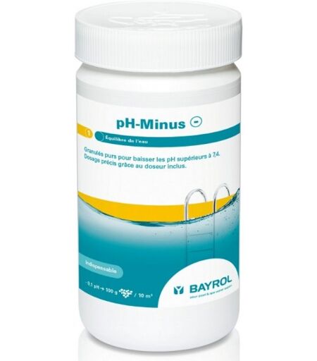L'ajustement du pH d'une eau de piscine s'avère être une action fondamentale. Ne la négligez pas si vous souhaitez continuer à profiter d'une baignade confortable ! [fsm display="image" ids="1779" link="0"] Optez pour le Correcteur de pH Bayrol pH Minus/Moins Il ramène le pH dans sa zone idéale ! Le Correcteur de pH Bayrol pH Minus/Moins permet de baisser les pH supérieurs à 7,4. La pureté de sa formule assure une action efficace et rapide. Son dosage est facile grâce au doseur inclus. Adoptez dès maintenant le pH Minus de Bayrol et diminuez la valeur du le pH de votre eau dès qu'il dépasse 7,4. Compatible avec tous les traitements (brome, oxygène actif, PHMB,...) Compatible avec tous les systèmes de filtration (diatomées, cartouches, sable,...) Compatible avec tous les revêtements (liner, carrelage, silicomarbreux, polyester). Existe en boîte de 1,5 kg et en seau de 6 kg et 18 kg Information utiles Pour tous types de filtres Pour tout volume d'eau Quand : En cas de besoin pH : Entre 7,0 et 7,4 Où : Dans l'eau Dosage : -0.1 pH => 100 g pour 10 m³ Mode d'emploi Vérifier le pH deux fois par semaine, après chaque apport d'eau neuve et après chaque pluie. Pour assurer le confort de baignade et l'efficacité optimale des désinfectants, maintenir le pH entre 7,0 – 7,4 (7,4 – 7,6 pour le brome). Mettre directement pH-Minus en plusieurs endroits du bassin et devant les buses de refoulement, filtration en marche, puis laisser fonctionner la filtration en continu. Ne pas utiliser directement dans le panier de skimmer. Pour baisser le pH de 0.1, ajouter 100 g pour 10 m³ Laisser fonctionner la filtration pendant 2 à 3 heures après le traitement, vérifier le pH et le réajuster si nécessaire. Se référer à la notice technique ci-jointe et bien lire les consignes présentes sur l'emballage avant utilisation. Recommandations importantes La filtration doit nécessairement fonctionner chaque jour (au moins un temps égal à la température de l'eau divisée par 2. Effectuer de préférence cette opération le soir après la baignade. Une eau dure peut nécessiter des quantités plus importantes. N'ajoutez jamais plus 300 g de pH-Minus pour 10 m³ à la fois. Avertissements Dangereux. Respecter les précautions d'emploi. Ne jamais mélanger sous forme concentrée différents produits chimiques. Ajouter toujours le produit dans l'eau et jamais le contraire. ...