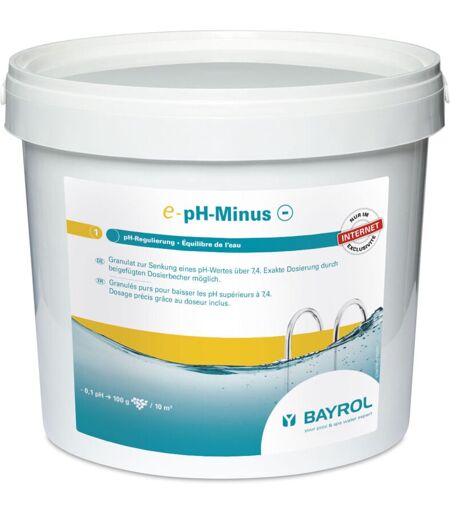 Description générale Le pH Minus de Bayrol est un correcteur de pH en granulés, spécialement conçu pour abaisser le pH de l'eau de votre piscine lorsque celui-ci dépasse 7,4. Grâce à sa haute pureté chimique et à sa dissolution rapide, il garantit une efficacité optimale pour maintenir un environnement de baignade sain et agréable. Spécifications techniques Conditionnement : Seau de 6 kg Type de produit : Granulés acides à dissolution rapide Composition : Hydrogénosulfate de sodium Dosage : 100 g pour 10 m³ d'eau pour abaisser le pH de 0,1 unité Compatibilité et accessoires Compatible avec tous les types de systèmes de filtration (diatomées, cartouches, sable...) Compatible avec tous les traitements (chlore, brome, oxygène actif, etc.) Convient à tous les revêtements de piscine (liner, carrelage, silico-marbreux, polyester) Installation Pour utiliser le pH Minus, vérifiez d'abord le pH de l'eau de votre piscine. Si le pH est supérieur à 7,4, dispersez directement les granulés dans ...