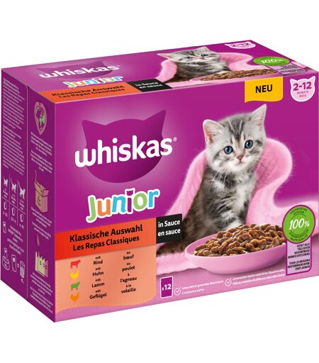 La nourriture pour chaton Whiskas Junior a été préparée avec un soin tout particulier. Les préférences et les besoins spécifiques des chatons jusqu'à 12 mois sont au cœur des recettes Whiskas Junior. La nourriture Whiskas Junior contient des... ...