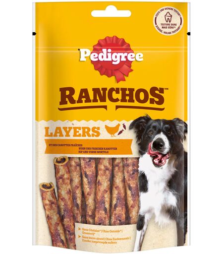 Découvrez les Pedigree Ranchos Layers, les friandises idéales pour votre fidèle compagnon. Ces snacks sont non seulement pauvres en graisses, mais également exempts de Colorants artificiels et de sucre ajouté. La texture épaisse satisfait le... ...