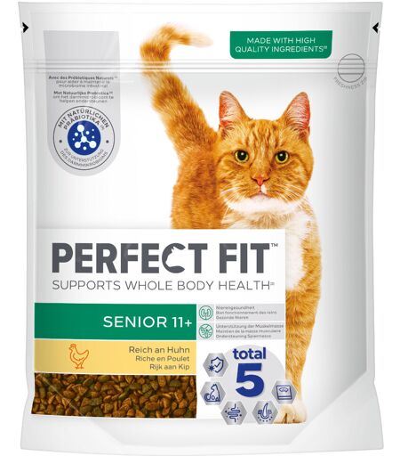 Recette adaptée et équilibrée : les croquettes Perfect Fit Senior 11+ - Riche en poulet ont été spécialement formulées pour les chats âgés. Développée en collaboration avec des vétérinaires et des nutritionnistes, leur formule "Total 5" combine 5... ...