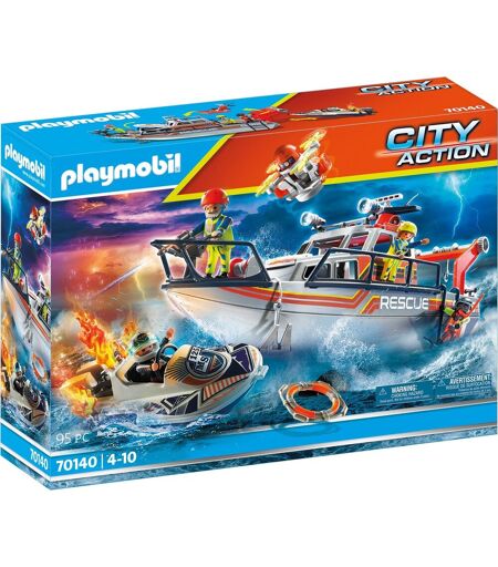 Playmobil 70140 City Action Bateau général des sauveteurs en mer En mer, le service de sauvetage en mer s'occupe des personnes en difficulté. Le capitaine du croiseur de sauvetage vient de recevoir un appel de secours. Un bateau à moteur a pris feu et la vie du conducteur est en danger. Les sauveteurs en mer se sont rapidement mis en route vers les coordonnées données. Arrivés sur les lieux de l'accident, ils jettent une bouée de sauvetage au conducteur du speedboat, puis entreprennent d'éteindre le véhicule en feu. Heureusement, les sauveteurs sont bien équipés et maîtrisent rapidement l'incendie. La vedette est tirée vers le croiseur de sauvetage à l'aide du treuil et ramenée au port. Contenu: Quatre figurines PLAYMOBIL, un bateau de sauvetage, un hors-bord, un drone, un équipement de plongée avec tuba et de nombreux autres extras pour des missions de sauvetage passionnantes dans la chambre des enfants. À partir de 4 ans ...