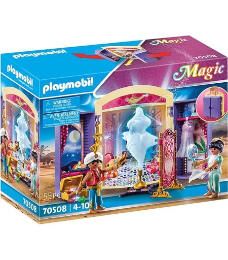 PLAYMOBIL 70508 Magic Boîte de jeu Princesse et Génie L'Orient est un lieu aux contes et aux légendes magnifiques. En parcourant le palais, le prince et la princesse ont découvert une mystérieuse lampe magique. En la frottant pour enlever la poussière, un esprit merveilleux apparaît. Est-ce qu'il sera capable d'exaucer leurs v¿ux ?Dimensions : fermé : 13 x 8 x 16 cm ; ouvert : 25 x 6,5 x 16 cm (LxPxH) Contient: 55 pièces À partir de : 4 ans ...