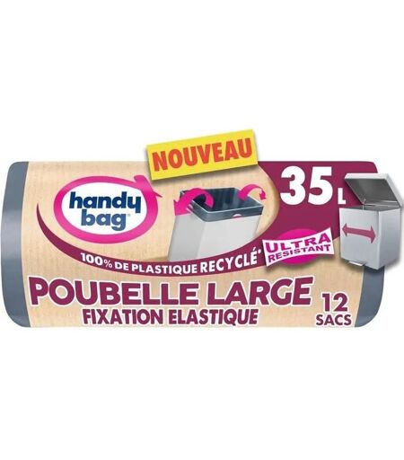 Handy Bag - Sacs poubelle à fixation élastique Poubelle Large 35L x 12 sacs - Adapté aux poubelles rectangulaires - Ultra Résistant et étanche : film triple épaisseur - 100% plastique recyclé ...