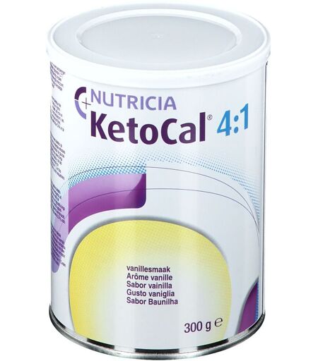 Il est important d'avoir une alimentation variée et équilibrée et un mode de vie sain.KetoCal est une denrée alimentaire en poudre, complet, riche en graisses et pauvre en glucides. Il contient une quantité équilibrée d'acides aminés essentiels et non essentiels, de glucides, vitamines, sels minéraux et oligo-éléments.Pour un groupe important de patients, les antiépileptiques n'ont pas d'effet. Un régime cétogène peut alors être recommandé. Un régime cétogène nécessite une alimentation contenant très peu de glucides et beaucoup de lipides. KetoCal est un aliment spécial adapté à ce régime cétogène. Sans : gluten, fructose, fibres. Contient du lait, du sojaKetoCal est une denrée alimentaire destinée à des fins médicales spéciales. Une alimentation médicale est recommandée par votre médecin ou votre diététicien.Composition :Huiles végétales raffinées (huile de palme, huile de soja, huile de tournesol) , protéines du lait (caséine, lactosérum), lécithine de soja, fibres alimentaires (cellulose, inuline, fructo-oligosaccharides, gomme arabique, amidon résistant, polysaccharides de soja), carbonate de calcium, sirop de glucose déshydraté, anti-agglomérant (E551), citrate tri-potassique, chlorure de potassium, chlorure de sodium, triphosphate de calcium, arôme, L-arginine, L-cystine, bitartrate de choline acide arachidonique issue de Mortierella alpina, acide docosahexaénoïque hautement raffiné issu de Crypthecodinium cohnii, L-tryptophane, oxyde de magnésium, caséinate de sodium (du lait de vache), L-ascorbate de sodium, L-phénylalanine, dextrine-maltose, acide L-ascorbique, L-valine, L-tyrosine, L-carnitine, taurine, sulfate ferreux, émulsifiant (E471), acétate de DL-α-tocophérol, édulcorant artificiel (sucralose), inositol, L-histidine, sulfate de zinc, nicotinamide, D-pantothénate de calcium, sulfate de manganèse, sulfate de cuivre, chlorhydrate de thiamine, chlorhydrate de pyridoxine, riboflavine, acétate de rétinol, antioxydants (E304(i), E306), acide ptéroylmonoglutamique , iodure de potassium, molybdate de sodium, chlorure de chrome, sélénite de sodium, vitamine K₁, D-biotine, cholécalciférol, cyanocobalamineValeur nutritionnelle : Pour 100 gValeur énergétique2897 kJ / 703 kcalLipides (89% En) dont saturés - TCM dont mono-insaturés dont poly-insaturés - acide linoléique - acide alpha-linolénique AA DHA EPA69,2 g26,7 g-22,8 g19,7 g16,2 g1,7 g117 mg110 mg-Glucides (2% En) Glucose Fructose Lactose Maltose Saccharose Polysaccharides Acide(s) organique(s)2,9 g0,05 g0,06 g0,25 g0,08 g0,41 g1,9 g0,47 gFibres (1% En)5,3 gProtéines (8% En)14,4 gSel1,3 gEau-Minéraux Na K Cl Ca P Mg529 mg848 mg799 mg770 mg462 mg107 mgOligo-éléments Fe Zn Cu Mn F Mo Se Cr I8 mg4 mg0,55 mg0,91 mg3,7 µg31,7 µg30 µg16,3 µg86,2 µgVitamines A Caroténoïdes D E K Thiamine Riboflavine Niacine Niacine Acide pantothénique B6 Acide folique ... ...