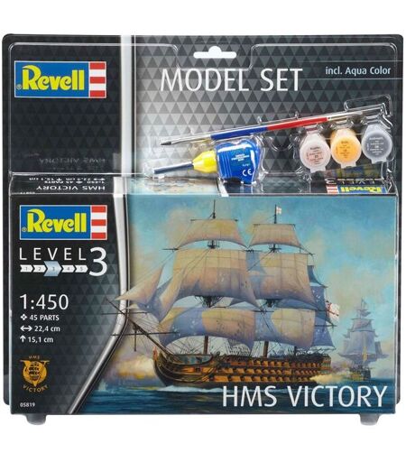 Maquette en plastique HMS Victory : 1:450 Le HMS Victory est un navire de ligne de 1er rang britannique à trois-mâts voiles carrées. Il est principalement connu comme le vaisseau de l'amiral Nelson lors de la bataille de Trafalgar. Il connut une succession de victoires à la tête de la flotte britannique entre 1778 et 1812. Dimensions de la maquette : 22.4 cm x 15.1 cm Les peintures et la colle sont fournies. Age minimum : 10 ans ...