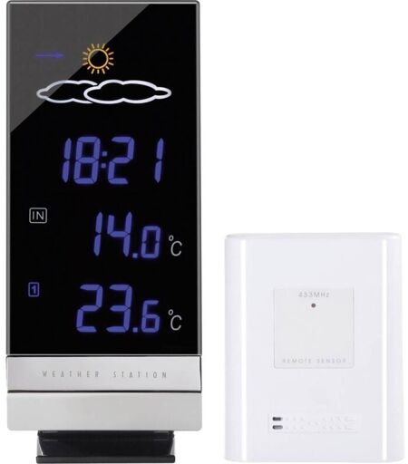 Informations techniques Alimentation en tension station : 230 V (sur bloc d'alimentation), inclus, 2x Pile LR3 (AAA), incluse Capteur tension d'alimentation : 2x Pile LR6 (AA), à commander séparément Couleur du cadran/ de l'écran : vert-gris Dimensions (station de base) : 191 x 80 x 23 mm Dimensions capteur(s) : 73 x 94 x 23 mm Fonctions (station météo) : prévisions météo, affichage des tendances, valeurs Max/Min, pression atmosphérique, horloge radiopilotée (DCF77), niveau de charge pile/batterie Gamme de mesure (température intérieure) : -10 à +60 °C Gamme de mesure température extérieure : -20 à +60 °C Nombre de capteurs max. : 3 Portée max. : 30 m Prévisions météorologiques : 12 à 24 heures Signal de transmission (stations météo) : radio 433 MHz Type d'affichage (numérique/mécanique/analogique) : numérique Station météo sans fil écran couleur Lumax Mesure le climat à proximité immédiate de l'appareil. La station peut, en plus, recevoir les mesures relevées par 3 thermomètres ...