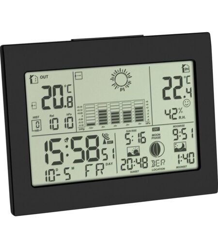 Description générale La station météo sans fil TFA 35.1155.01 vous informe instantanément sur les conditions climatiques actuelles et les prévisions. Grâce à un baromètre électronique intégré, elle mesure la pression atmosphérique et affiche des symboles météo pour vous aider à anticiper le temps à venir. Avec un affichage clair, vous pouvez consulter la température intérieure et extérieure, l'humidité, les prévisions météorologiques, ainsi que les heures de lever et de coucher du soleil. Spécifications techniques Type : Station météo numérique Couleur : Noir Écran : LCD rétroéclairé en bleu Alimentation : 3 piles AAA (non incluses) pour la station, 2 piles AA (non incluses) pour le capteur Portée max. : 60 m Dimensions : 158 x 26 (51) x 123 mm (station), 50 x 30 x 97 mm (capteur) Gamme de mesure température intérieure : 0 à +50 °C Gamme de mesure température extérieure : -20 à +60 °C Gamme de mesure humidité intérieure : 20 à 95 % Compatibilité et accessoires Compatible avec jusqu'à ...