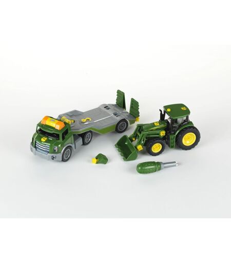 Un transporteur avec un tracteur John Deere à monter et à démonter ! Contenu : - 1 camion transporteur - 1 tracteur - 1 tournevis. L'enfant va adorer monter et démonter les deux véhicules avec l'aide de son super tournevis. Ces deux véhicules sont sous la marque John Deer, de couleurs vert, jaune et gris. Construisez le tracteur John Deere 6215 R à l'échelle de 1/24. Prenez le châssis, montez les pneus, le siège, la cabine du conducteur et le capot. Assemblez ensuite le camion transporteur : le châssis avec la cabine du conducteur et les pneus sur le semi-remorque. Mettez le tracteur sur le transporteur à l'aide du treuil. Activez les sons et lumières et partez à l'aventure avec ces véhicules ! Le jouet va développer la dextérité de l'enfant et a stimuler son imagination. Il va apprendre à visser ses premières pièces et à monter lui-même ses propres jouets. Un coffret adapté aux enfants de 3 ans et plus. Nécessite des piles : 3 x LR41 - AG3, incluses. Dimensions de la boîte : 60 x 13.5 x 27 cm. ...