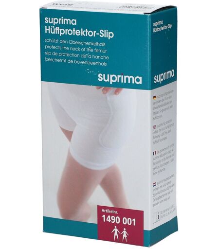 Suprima 1490 Slip Protecteur pour les Hanches Slip pour dames et hommes Matériel de haute qualité, tricot circulaire Avec poche à gauche et à droite pour y insérer le protecteur Livré sans les protecteurs Suprima 2007/2008 Indications Protection pour les hanches des personnes âgées en cas de chute Fermeture: à enfiler Coloris: blanc Tableau de mesure: TAILLE MESURE DE CONFECTION S 36/38 M 40/42 L 44/46 XL 48/50/52 XXL 54/56 Composition 58% coton, 36% PA, 6% élasthanne Conditionnement 1 slip ...