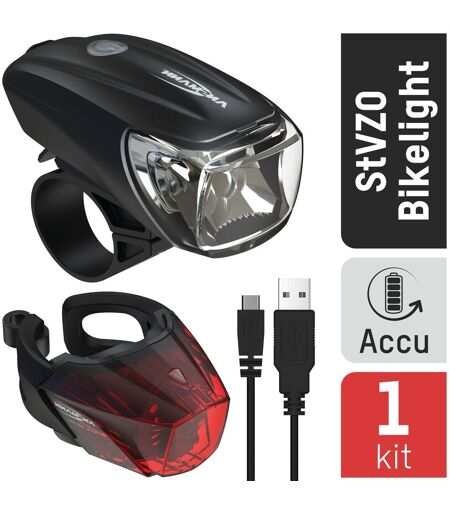 RECHARGEABLE : par câble USB MONTAGE FACILE : tenue plus sûre & plus fiable LUMINEUSE : LED 5 Watt avec 170 lumen & 50 lux FIABLE : réflecteur spécial dans la lampe frontale A LIVRER AVEC: lumière avant et arrière, fixation, câble ...