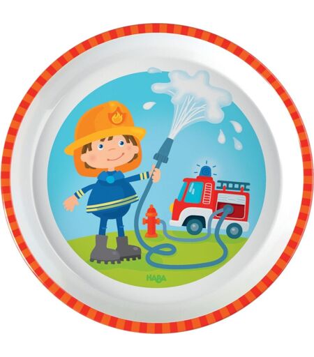 HABA 303692 Assiette Pompier Antidérapante grâce à un anneau en caoutchouc Adapté au lave-vaisselle Diamètre: 18 cm Matière: Mélamine ...