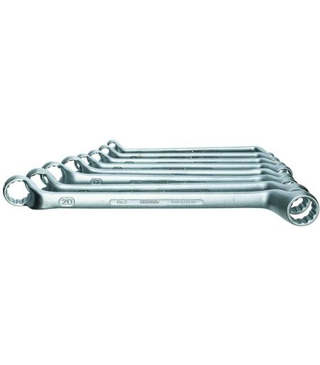 Jeu avec les dimensions les plus courantes, Fabrication conforme DIN 838, ISO 3318, ISO 1085, ISO 10104, Coudé, avec des anneaux à paroi mince, Acier vanadium 31CrV3, chromé, Surface mate, anti-éblouissante, Travail de forge de précision et usinage optimal: Anneau : à paroi mince, profondément coudé et incliné de 5°, avec profil UD - pour une transmission douce de la puissance, Grande rigidité en flexion - ne se brise pas et ne se fissure pas en cas de surcharge, ce qui réduit le risque de blessure, La surcharge est signalée par une déformation, Pour les écrous extrêmement enfoncés ou noyés, Qualité industrielle haut de gamme pour une utilisation intense en continu Profil de l'anneau UNIT-DRIVE Poids net [kg] 4,06 kg Ouverture de clé max. null Exécution Tief gekröpft, mit dünnwandigen Ringen Certifié VDE Nein REACH konform Taille de l'emballage 1 Contenu (nombre de pièces) 12 Matériau 31CrV3 Contenu null Norme DIN 838 ISO 3310 ISO 1085 ISO 10104 Liste de pièces (texte) 6x7 8x9 10x11 ...