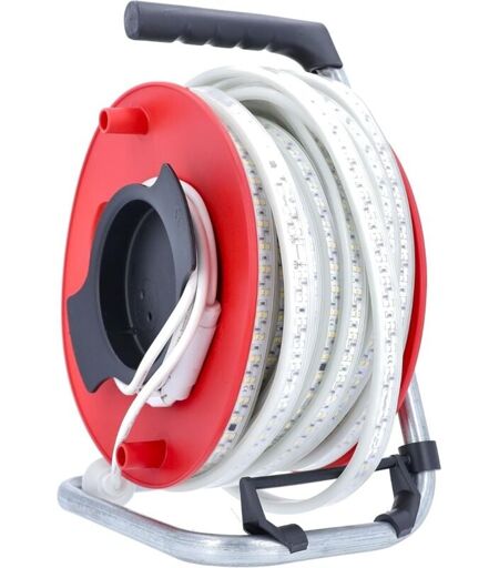 LED-Lichtband auf Trommel Ø285mm mit Kabelhaspel, verzinktem Fußgestell, geformtem Haltegriff und Feststellbremse. Ausführung des LED-Lichtbandes: fluoreszierend Eingang: AC 230V 16A Leistung: 12 W/m, 300 W/Rolle Lichtstrom: 1.500 lm/m Farbwiedergabeindex CRI: >80 Abstrahlwinkel: 120 Grad LED Lebensdauer: 30.000 Stunden Farbtemperatur: 4.000K Mantelmaterial: PVC Hochwertige EPISTAR 2835 LED IK10 Abmessungen Lichtband (BxH): 18 x 8mm Länge des Lichtbandes: 25m Schutzart: IP65 Verpackt im Farbkarton. ...