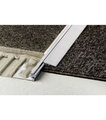 Profilé porteur aluminium anodisé mat - Hauteur 10 mm - Barre de 2,5 m - Fournisseur: SCHLUTER - Reference: AEVT100B20 - - Profilé de transition - Profilé de transition avec plage mobile permettant de s'adapter au revêtement adjacent - Un espaceur permet de prédéfinir le joint entre le carreau et profilé - Profilé de transition réglable, utilisé entre des revêtements de sol de hauteurs différentes (par exemple pour réaliser la transition entre un carrelage et une moquette) - Grâce à sa partie mobile, il s’adapte quelle que soit la hauteur du revêtement adjacent, dont il protège efficacement les chants et évite ainsi la formation d’une butée - Peut être mis en œuvre dans des zones soumises à de fortes contraintes (entrées de garage et de halls) - L’espaceur permet de prédéfinir un joint régulier entre le carreau et le profilé - Matière: en aluminium (-AV) et en aluminium anodisé (-AEV) Dimensions et Poids: - Hauteur: 8 ou 10 ou 12,5 ou 15 ou 17,5 ou 20 mm selon le modèle - Longueur: 1 ...