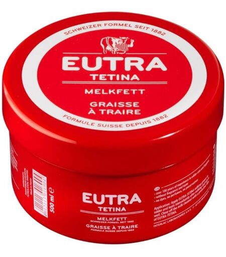 EUTRA : Une qualité optimale depuis plus de 125 ans pour la traite des bovins, ovins et caprins. Graisse à traire de protection et soin des pis et des trayons. Pour traire : vaches, moutons et chèvres. Préparée à partir d’huiles minérales raffinées de haute qualité, elle facilite la traite grâce à ses propriétés de lubrification. Elle permet également de protéger et soigner les pis en créant une couche protectrice et aide à la guérison des petites blessures. Formule Suisse originale. Sans agents conservateurs, sans désinfectants, sans substances parfumées, sans colorants. Composition : Paraffinum liquidum, Petrolatum, Paraffin. Format 500 ml ...
