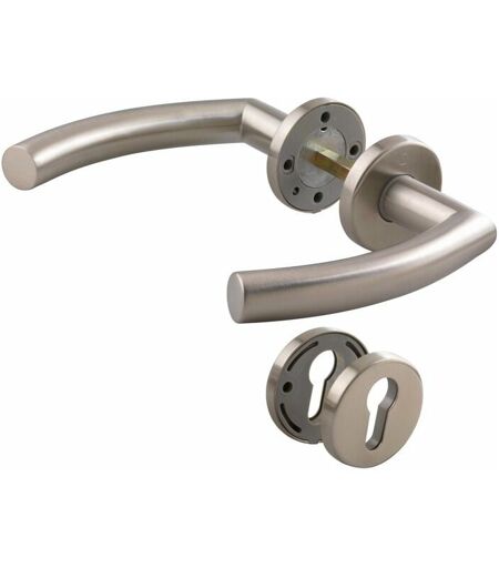 Description générale Ensemble complet de béquilles en inox 18/10, conçu pour une utilisation intensive dans des lieux publics. Ce produit est certifié selon la norme DIN EN 1906, catégorie d'utilisation grade 3, et est idéal pour les portes d'épaisseur standard de 35 à 45 mm. Il comprend des rosaces de fonction et un carré à montage rapide de 7 mm. Spécifications techniques Matériau : Inox 18/10 Diamètre de la rosace : 52 mm Longueur de la béquille : 137 mm Saillie de la béquille : 66 mm Épaisseur de la porte : 35 à 45 mm (37 à 47 mm en fonction clé L et 40 à 45 mm pour version condamnation) Ressort de rappel : Oui Montage : Carré 7 mm à montage rapide Compatibilité et accessoires Compatible avec portes d'épaisseur 35 à 45 mm Livré avec paire de rosaces de fonction Inclut tige carrée de 7 mm Installation Le produit est livré avec des instructions de montage. La fixation est non traversante, ce qui facilite l'installation sans endommager la porte. Utilisation Idéal pour les portes ...