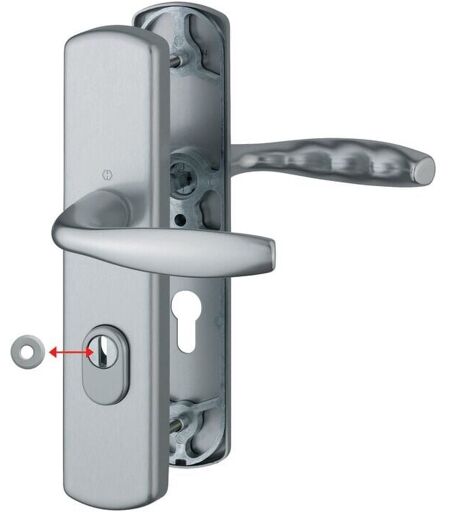 Poignée de porte de sécurité sur plaque longue – aspect inox anodisé F9 Avec protecteur de cylindre – clé I – entraxe serrure 70 mm – fixation 195 mm Aluminium – carré 7 mm – poignée 133 mm – profondeur 61 mm Plaque 250 × 54 mm – pour porte de 42 à 47 mm d'épaisseur Norme DIN EN 1906 – usage fréquent (grade 3) – résistance corrosion grade 4 Montage rapide sans outil – fabrication européenne – garantie 10 ans ...