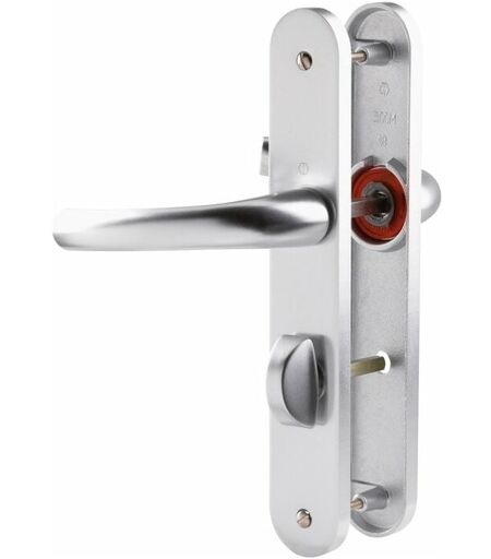 Idéale pour les portes de salle de bain, les portes WC, pour les pièces d'eau Poignée de porte avec bouton de condamnation, poignée de porte sur plaque Ensemble de poignées : béquille double Gris argent Entraxe de fixation : 195 mm Épaisseur de porte : 38 mm à 42 mm ...