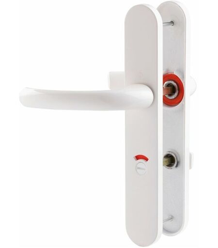 Idéale pour les portes de salle de bain, les portes WC, pour les pièces d'eau Poignée de porte avec bouton de condamnation à voyant, poignée de porte sur plaque Ensemble de poignées : béquille double Blanc pur Entraxe de fixation : 195 mm Épaisseur de porte : 38 mm à 42 mm ...