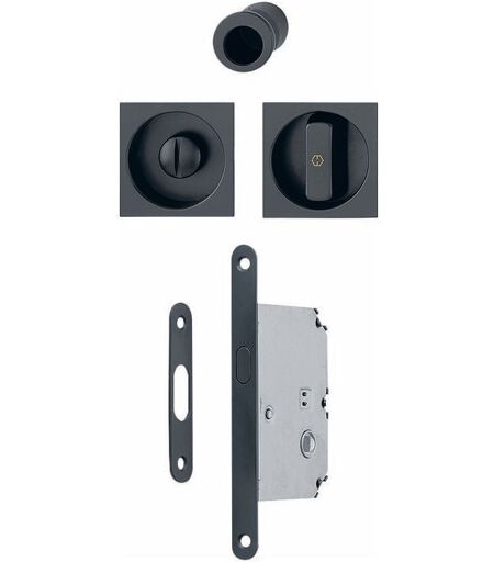 Set complet de condamnation noir mat Serrure à crochet, à mortaiser Épaisseur de porte 38 - 48 mm Épaisseur du carré pour WC 8 mm Axe 50 mm Pastille de dé-condamnation / olive de condamnation Gâche fournie Carré télescopique ...
