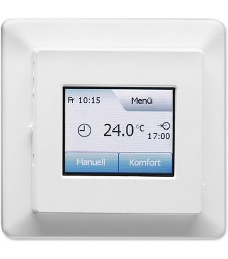 • Régulateur électronique de température au sol pour montage encastré • Écran tactile couleur de 2,2 pouces • Minuterie hebdomadaire programmable individuellement • Détermination automatique du temps de chauffage • Minuterie hebdomadaire, protection contre le gel et détection de fenetre ouverte • Fonction marche/arret • Peut etre intégré dans les programmes de commutation de surface • Compatible avec d’autres capteurs de température de sol Détails techniques : • Tension nominale : 230 V • Fréquence : 50/60 Hz • Capacité de commutation : 16 A • Différence de commutation : 0,4 K • Plage de réglage : 5-35 °C • Couleur : blanc • Type d'installation : encastré • Hauteur : 84 mm • Largeur : 84 mm • Profondeur : 40 mm> ...