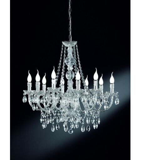 Lustre baroque chrome 10 lampes. Nous vous proposons ce chandelier tendance et original qui s'integrera parfaitement dans un intèrieur à la fois design et baroque. Caractéristiques: - Fabrication acrylique chrome et transparent - Dimensions: Diamètre : 76 cm, hauteur: 165 cm, - Eclairage: 10 x E14 max 40W (non inclus) ...