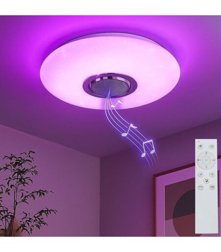 Description Ce plafonnier LED moderne combine des fonctions d'éclairage polyvalentes avec une technologie innovante. Son design en blanc avec un effet d'étoiles scintillantes en fait un accroche-regard élégant pour les pièces à vivre, les chambres à coucher ou les chambres d'enfants. Grâce à la commande CCT du blanc chaud au blanc froid, à la luminosité variable et au changeur de couleurs RGB intégré avec option de fixation, l'éclairage s'adapte à toutes les ambiances. De plus, l'effet arc-en-ciel garantit des moments de lumière particuliers, tandis que la veilleuse crée une atmosphère douce. Le haut-parleur Bluetooth intégré de 5 watts permet de diffuser de la musique sans fil et de la contrôler facilement à l'aide de la télécommande. Avec une puissance de 15,5 watts, 1700 lumens et une durée de vie d'environ 20.000 heures, la lampe offre une solution d'éclairage efficace et durable. Parfait pour tous ceux qui souhaitent allier technologie moderne et lumière d'ambiance. Une ampoule ...