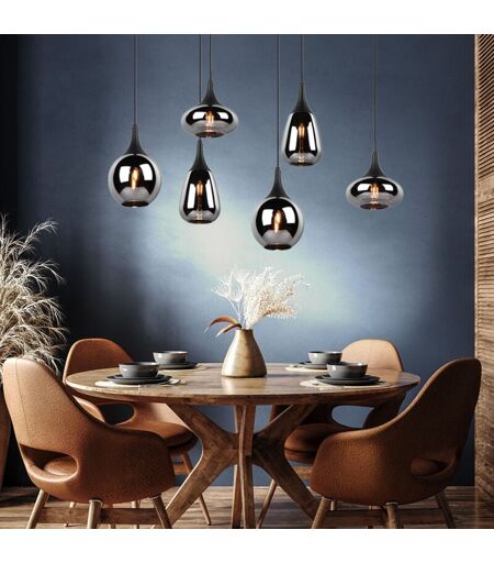Description La suspension attire particulièrement l'attention dans votre espace de vie grâce à ses élégants abat-jour en verre ! Les différentes formes des six abat-jour ainsi que la composition du métal et du verre créent une atmosphère lumineuse magnifique et unique et insufflent une touche moderne à votre salle à manger. Grâce au design des couleurs en noir mat et aux abat-jour en verre en chrome cuit à la vapeur, il existe de nombreuses possibilités pour d'autres couleurs et permet ainsi une intégration merveilleusement simple dans les concepts d'habitat existants. Les ampoules ne sont pas incluses dans la livraison. Détails lampe • Type de lampe : suspension • Matériau : métal, verre • Couleur : noir, chrome • Hauteur réglable avant assemblage • Classe de protection : IP20 • Classe de protection : 1 • 6 flammes • Longueur x largeur x hauteur en cm : 93 x 34 x 150 • Poids : 5,1 kg • Douilles : 6x E14 • Ampoules non incluses • Puissance de la lampe : max. 8x 40 watts. • ...
