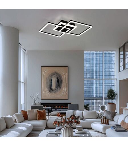 Description Le plafonnier impressionne par son design moderne et inhabituel. Le plafonnier complète tout style d'ameublement moderne et met en valeur votre espace de vie de manière optimale. Le variateur intégré vous permet de choisir entre trois niveaux de luminosité différents à l'aide d'un interrupteur classique. En graduant l'intensité lumineuse de 100 % à 50 % et 25 %, la lampe peut servir différentes ambiances lumineuses. Grâce à la couleur noir mat, la lampe peut être combinée avec de nombreux styles d'ameublement. De plus, la lampe est dotée d'une technologie LED moderne, qui se caractérise par une qualité de lumière et une efficacité énergétique élevées. La source lumineuse LED est installée en permanence dans la lampe. Détails lampe • Type de lumière : plafonnier • Matériau : métal • Couleur : noir mat • Classe de protection : IP20 • Classe de protection : 2 • Variateur : voir description • Longueur x largeur x hauteur en cm : 57 x 35 x 7 • Source lumineuse : LED • Lampes ...
