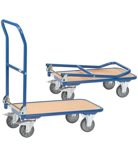 Chariot en acier tubulaire avec poignée rabattable - Construction en acier tubulaire - Revêtement par poudre, RAL 5007 bleu brillant - 2 roulettes pivotantes, avec freins conformément à la norme DIN EN 1757-3 - 2 roulettes fixes - Pneus TPE - Moyeux avec roulements à billes à gorge profonde - Plate-forme en bois décor hêtre - Poignée de poussée sur la plate-forme, rabattable >. ...