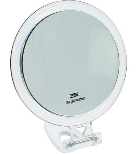 Miroir de voyage en acrylique, grossissement 20x. Ø 10,5 cm, taille : 13 / 23,5 cm. ...