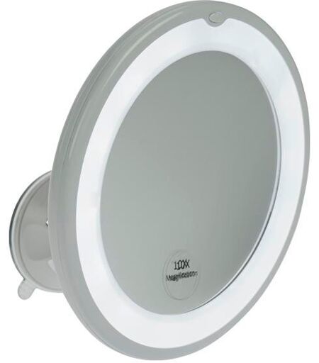 Miroir à ventouse en plastique blanc avec éclairage LED, grossissement 10x, Ø 17,5 cm. Ventouse sur l'articulation à rotule pour le vissage sur le disque. Peut être pivoté dans toutes les directions. Comprend 3 piles AAA. ...