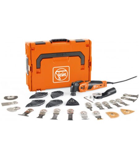 • Systeme anti-vibrations : travail sur et agréable sur le long terme avec tres peu de vibrations et un excellent amortissement du bruit. • Porte-outil StarlockMax : vitesse de travail plus rapide et précision accrue grâce a une transmission de puissance maximale sans perte. • QuickIN : changement d'accessoire en moins de 3 secondes grâce au systeme de serrage rapide FEIN (sans outil et breveté). • Le porte-outil StarlockMax vous permet d’avoir acces a pres de 180 accessoires FEIN dans les catégories de puissance Starlock, StarlockPlus et StarlockMax. • Moteur HIGH POWER FEIN 450 W : moteur HIGH POWER endurant et résistant a forte densité de cuivre pour une vitesse de coupe et une vitesse de travail maximales. • Régulateur tachymétrique : vitesses constantes meme sous charge et régulation électronique en continu de la vitesse de rotation. • Engrenage métallique : capacité de charge élevée et durée de vie maximale grâce aux pieces d'engrenage métalliques. • Interface mécanique : pour une utilisation stationnaire avec le support de table ou de perçage et pour fixer la butée de profondeur. • Câble industriel : important rayon d’action grâce au câble en caoutchouc de 5 metres dans une qualité industrielle. • Dispositif d’arret de sécurité électronique : protection de l’utilisateur, p .ex. blocage de la lame de scie. • Parfaitement équipé pour chaque utilisation. Travail mobile avec le systeme L-BOXX. Parametres techniques • Puissance absorbée: 450 W • Puissance utile: 250 W • Oscillations: - trs/min • Porte-outil: StarlockMax • Changement d’accessoire: QuickIN • Amplitude: 2 x 2,0° • Câble avec fiche: 5 m • Poids selon EPTA: 1,60 kg Livraison • 2 lames de scie standard E-Cut curved (35 mm) • 2 lames de scie standard E-Cut curved (65 mm) • 1 lame de scie de précision E-Cut BIM (35 mm) • 1 lame de scie de précision E-Cut BIM (65 mm) • 1 lame de scie E-Cut Long-Life (10 mm) • 2 lames de scie E-Cut Long-Life (35 mm) • 1 lame de scie E-Cut Long-Life (32 mm) • 1 lame de scie E-Cut Long-Life (42 mm) • 1 lame de scie E-Cut Carbide Pro (32 mm) • 1 lame de scie segmentée (O 85 mm) • 1 lame a concrétion carbure (O 75 mm) • 1 râpe concrétion carbure (triangulaire) • 1 spatule • 1 lame, forme champignon 6 390 31 28 01 2 • 1 multilame • 1 patin de ponçage perforé • Resp. 10 feuilles abrasives, perforées (grain 60, 80, 120, 180) • 1 dispositif d'aspiration • 1 coffret (L-Boxx 136)> ...