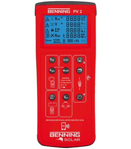 Testeur d'installation PV et appareil de mesure de la courbe caractéristique PV 2 - Testeur d'installation pour des tests fiables avec séquence de test automatique - Connexion de mesure sécurisée même lorsque le système PV fournit de l'énergie - Interface USB pour le téléchargement des valeurs mesurées - Horloge en temps réel intégrée pour le stockage des valeurs mesurées avec horodatage - Résultat de mesure ISO avec affichage bon/mauvais - Connexion radio avec l'appareil de mesure du rayonnement et de la température Benning SUN 2 -. Affichage automatique de la polarité de la tension avec avertissement acoustique/visuel en cas de polarité erronée - Connexion directe à tous les modules PV standard avec connecteur MC4 ou Sunclix - Pour l'installation et les tests de répétition de systèmes photovoltaïques raccordés au réseau - Pour l'installation et les tests de répétition de systèmes photovoltaïques raccordés au réseau.Systèmes photovoltaïques raccordés au réseau selon VDE 0126-23 (DIN ...